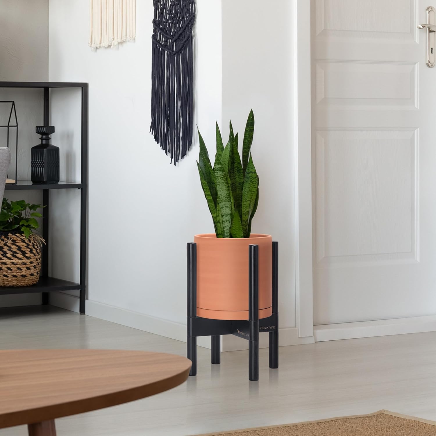 D'vine Dev Terracotta Planter with Ebony Stand - 8 Inch Modern Round Flower Pot with Wood Planter Holder, Terracotta, 55-B-M-5