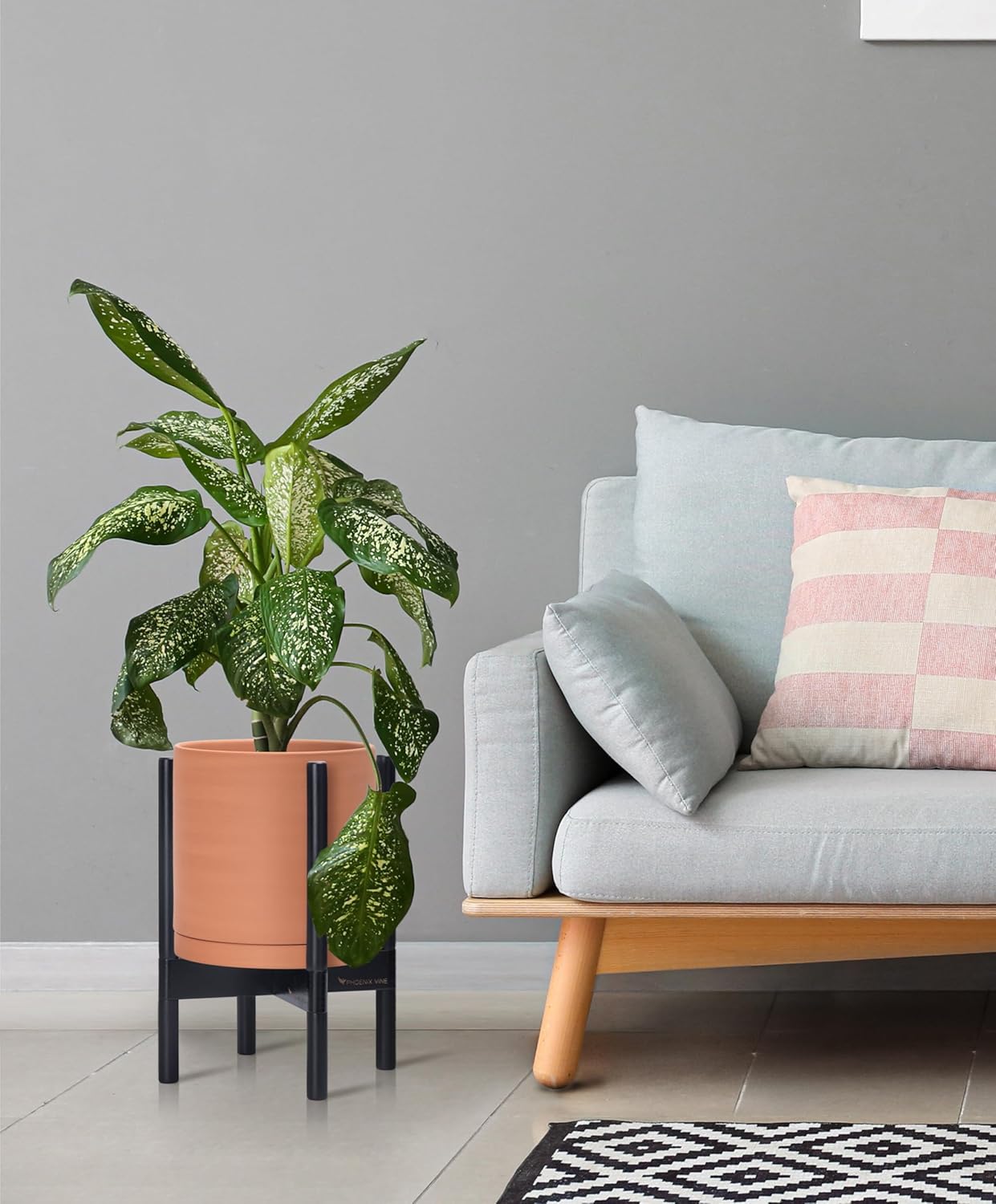 D'vine Dev Terracotta Planter with Ebony Stand - 10 Inch Modern Round Flower Pot with Wood Planter Holder, Terracotta, 55-B-L-5