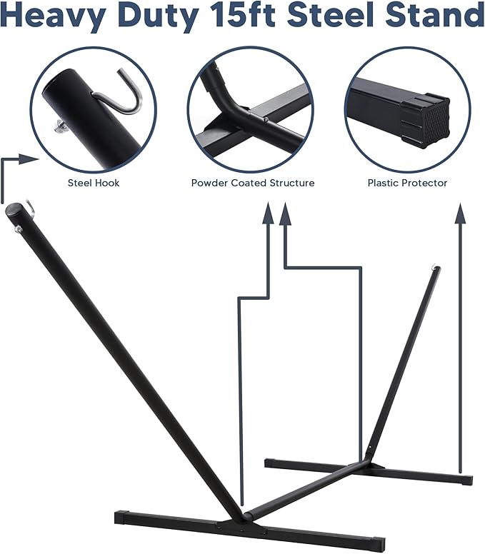 - Freestanding Hammock with Portable Stand: No damage to trees. Created to be stable and long-lasting, the 15 ft stand is made from powder-coated heavy gauge steel. It can be easily assembled in minutes without any tools, and it could be disassembled easily, making it to be a portable hammock. Feel free to contact us if you have any questions during use within one year of purchase. We are always here to help