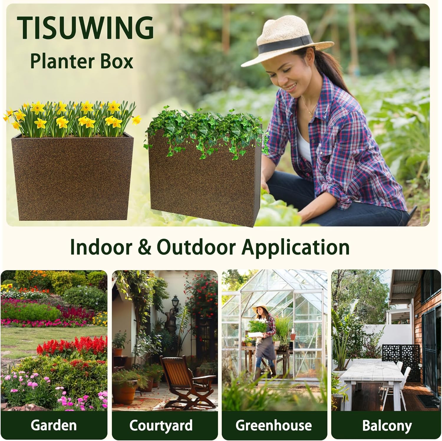 - [Size and Accessories]: 35.5*10*28 inches large flower planter, we are equipped with 12 screws, a hexagonal screw wrench, 4 foot pad , Note: This metal flower box needs to be assembled. The screws are fixed on the board and need to be unscrewed before installation!