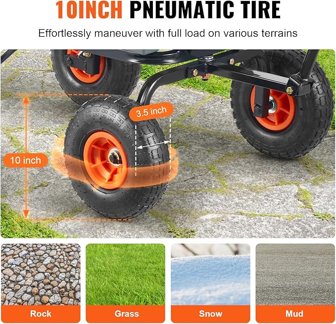 - 10in ALL TERRAIN WHEELS: With 10" rubber tires, the dump garden cart provides excellent shock absorption, navigating uneven garden terrain or grassy slopes, ensuring smooth transport.