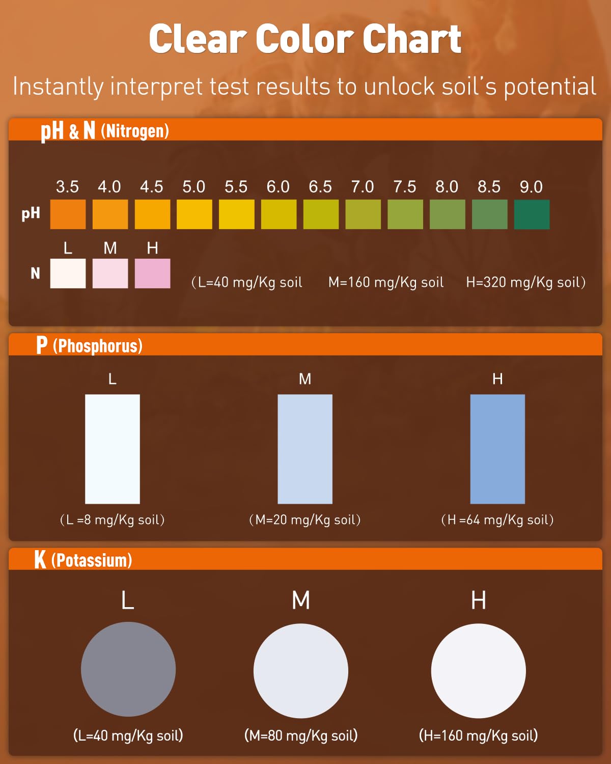 - Fast & Accurate Result: Precise test ranges: pH: 3.5-9; Nitrogen: 40-320 mg/kg soil; Phosphorus: 8-64 mg/kg soil; Potassium: 40-160 mg/kg soil. The ultra-sensitive soil test strips or tablets capably detect even slight variations in just minutes