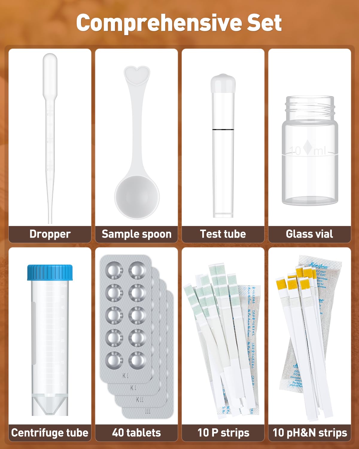 - Practical Accessories: The soil pH test kit includes all the tools needed – 2 centrifuge tubes, 1 test tube, 1 glass vial, 1 dropper, 1 grinding rod, 1 sample spoon, 1 color chart and 1 instruction manual. Always prepare you for spot-on soil analysis