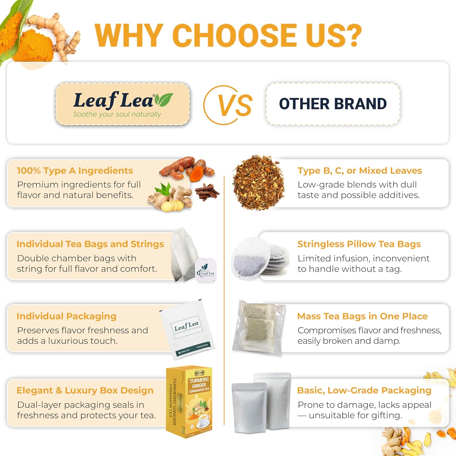 LeafLea Turmeric Ginger Cinnamon Tea, 120 Individually Wrapped Tea Bags, 100% Natural Herbal Blend with Pure Ginger and Turmeric, Supports Digestion & Immune Health, Caffeine-Free, No Sugar