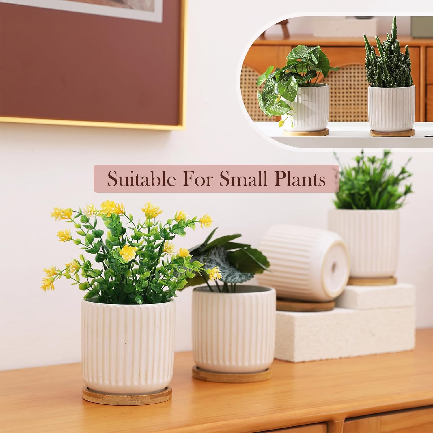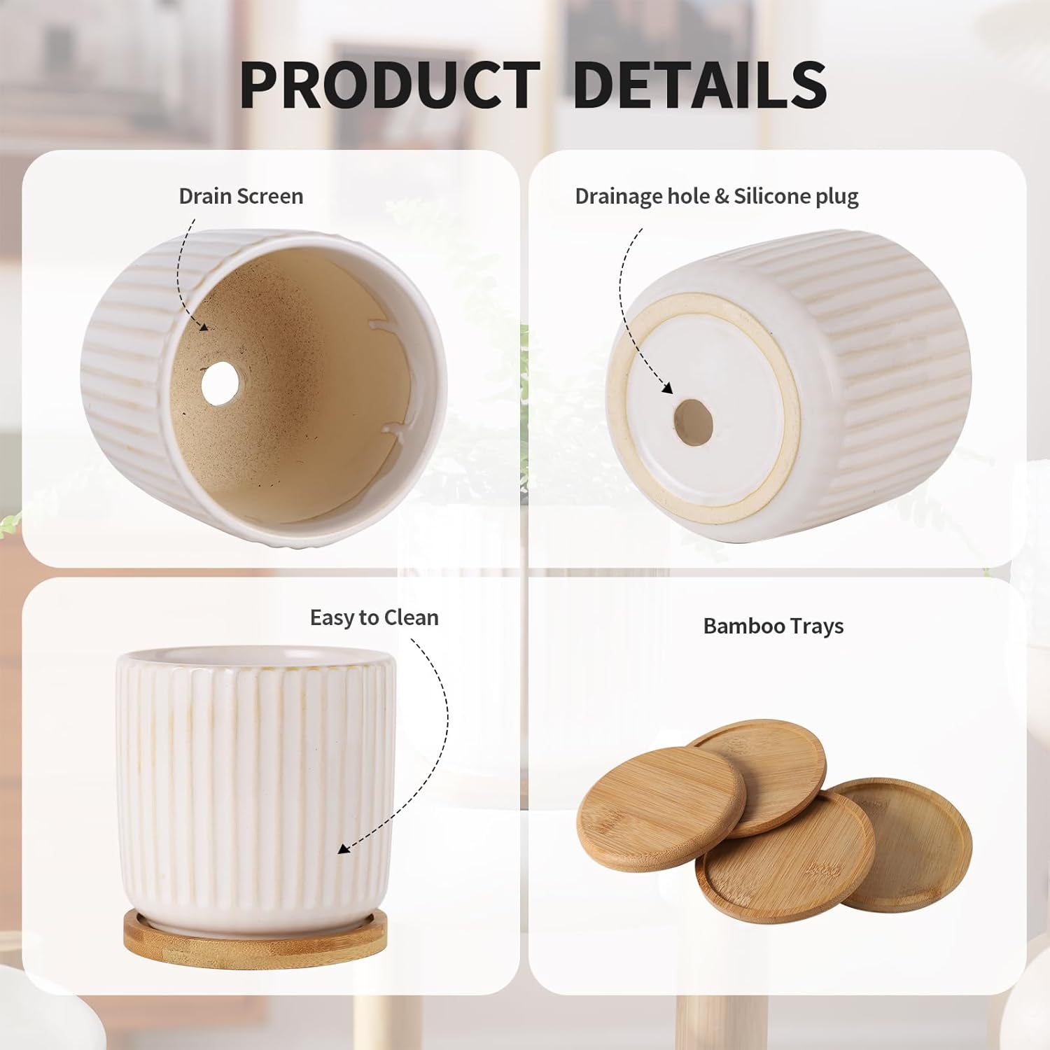 OMAYKEY 4 Inch Ceramic Plant Pot with Saucer, Creative Stripe Small Planters Pots with Drainage Hole and Mesh Pads for Succulent, Cactus, Herbs, White - Set of 4