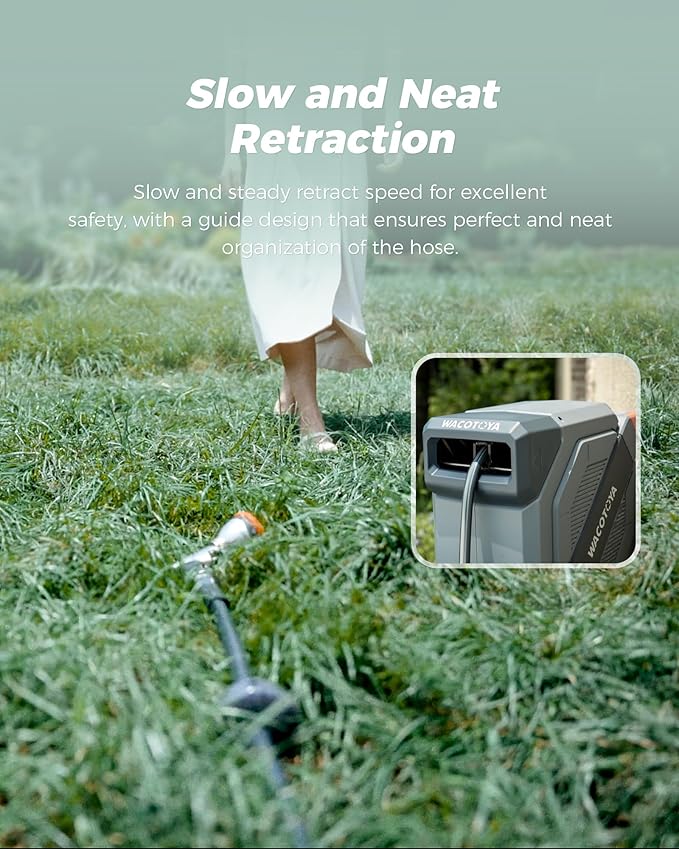 - Born for Irrigation: WACOTOYA engineers designed a gentle water pressure system for the auto rewind water hose reel to protect plants and ensure efficient irrigation with high flow rate