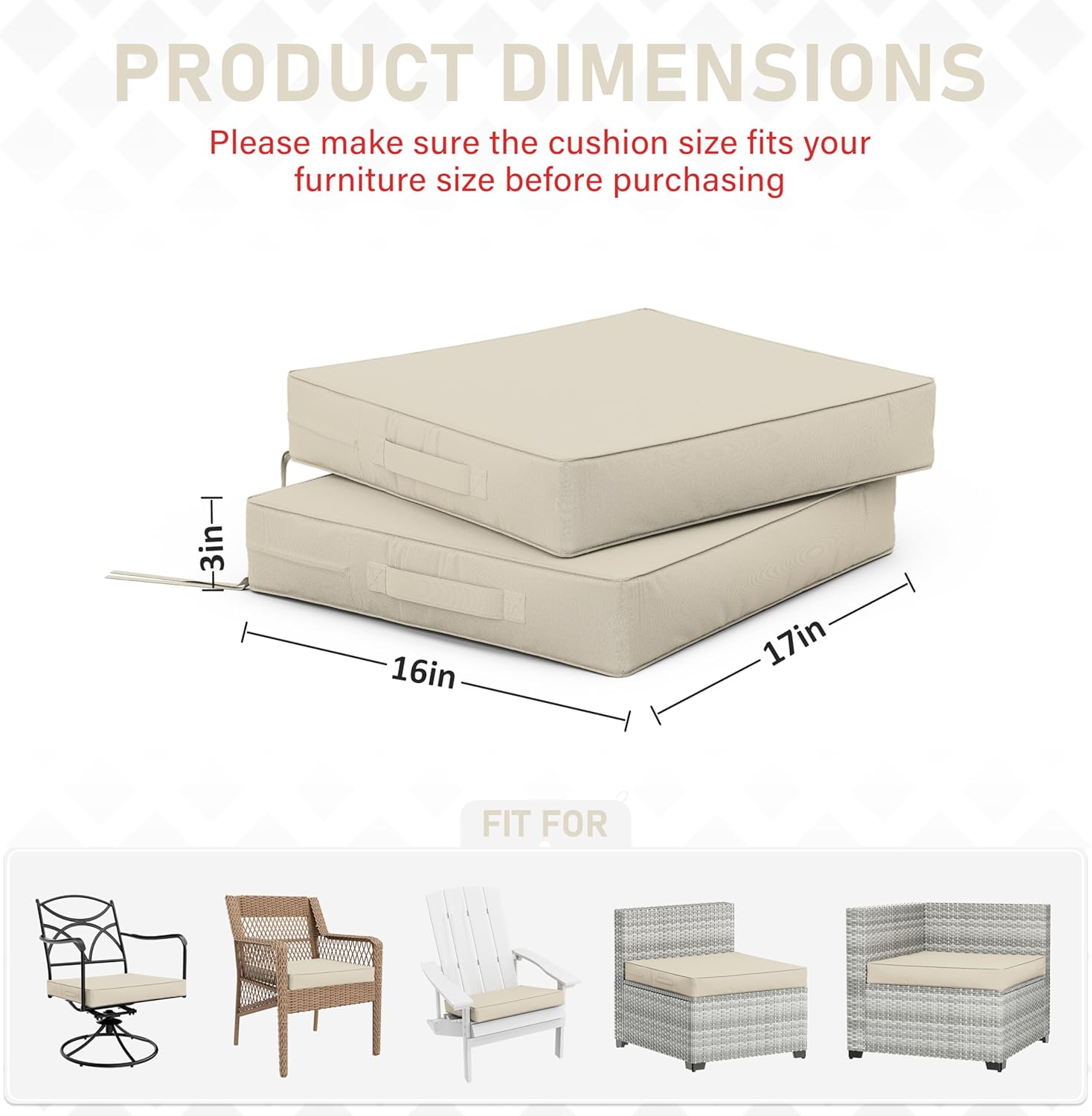 Patio Chair Cushions 17 X 16 X 3 Inch Waterproof Outdoor Seat Cushions for Patio Furniture, Outdoor Sofa Couch Pads with Ties & Handle, Set of 2, Cream