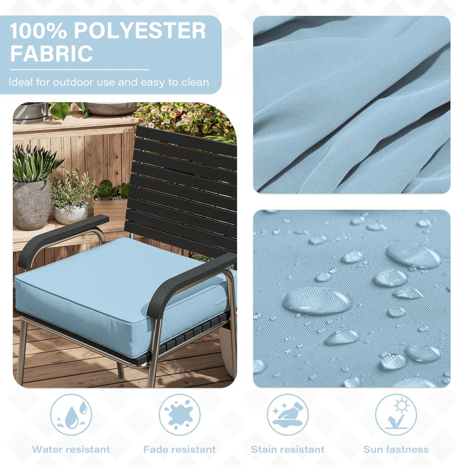 - π WEATHERPROOF - The Patio Furniture Chair Cushion is made of double-layer waterproof coated fabric that is waterproof on all sides, keeping the rain out and keeping the foam dry and tidy. Even in bad weather, it looks brand new with just a little care from you!