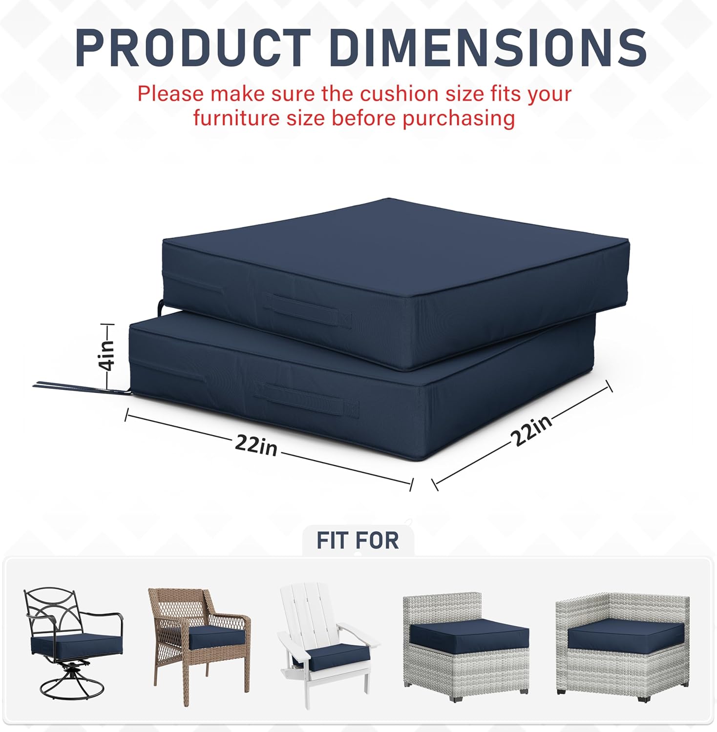 - π About Size - The Tounosnt Double Seat Cushion Set package includes 2 outdoor chair cushions (22β L x 22β W x 4β H). Please measure your seating area. The correct size is essential for enhancing your comfort and overall aesthetic.