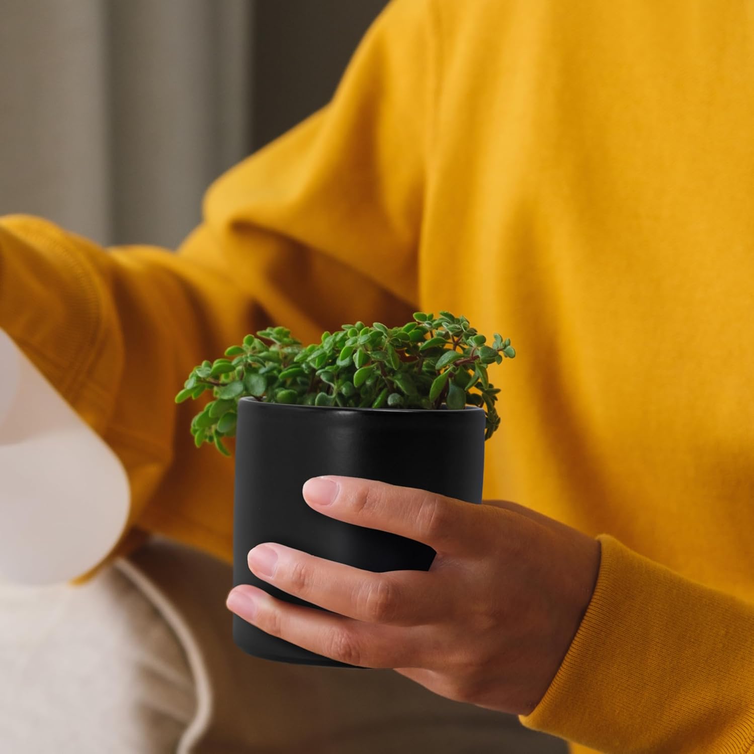 - Simple, elegant, and modern cylindrical straight round planter pot with saucer and drainage hole.