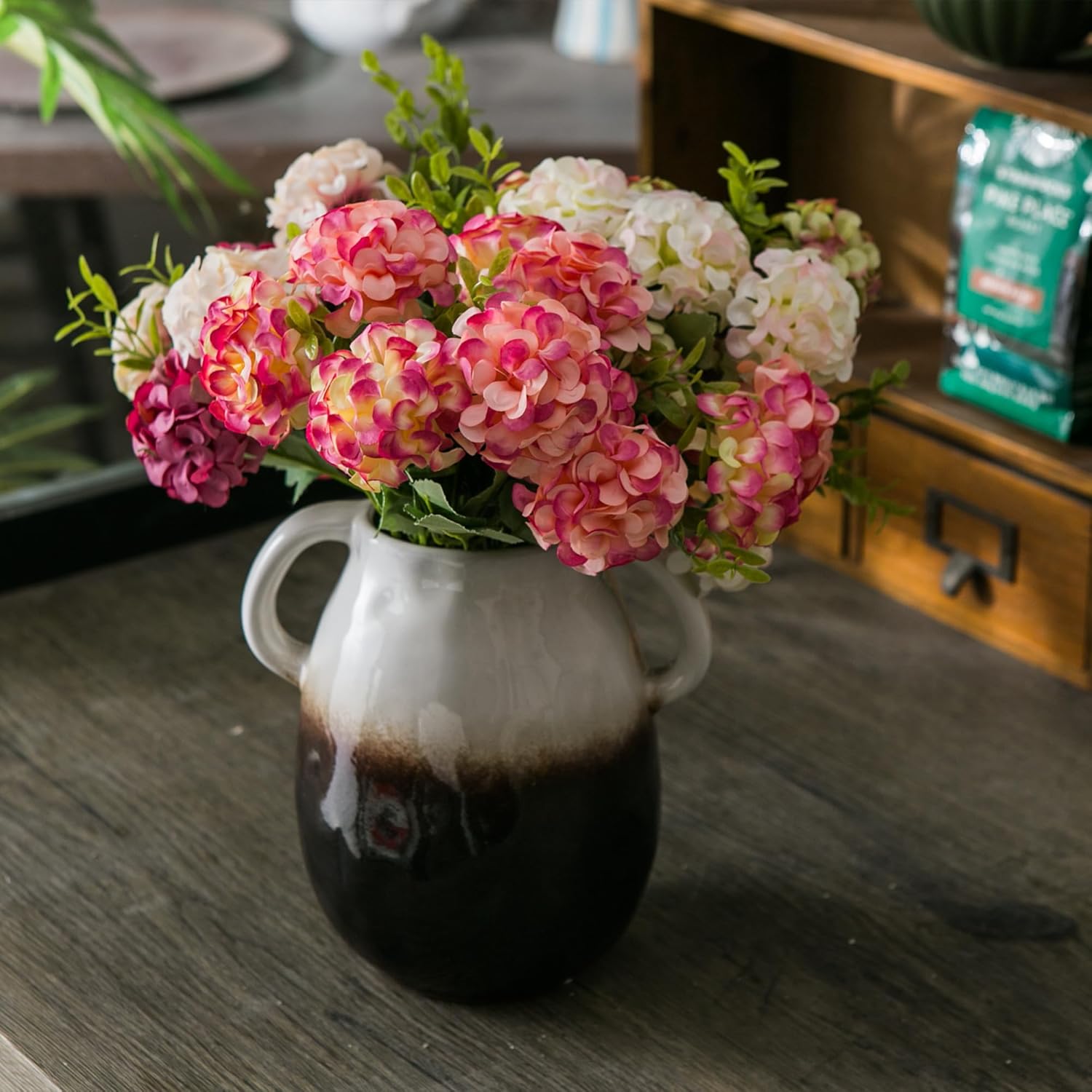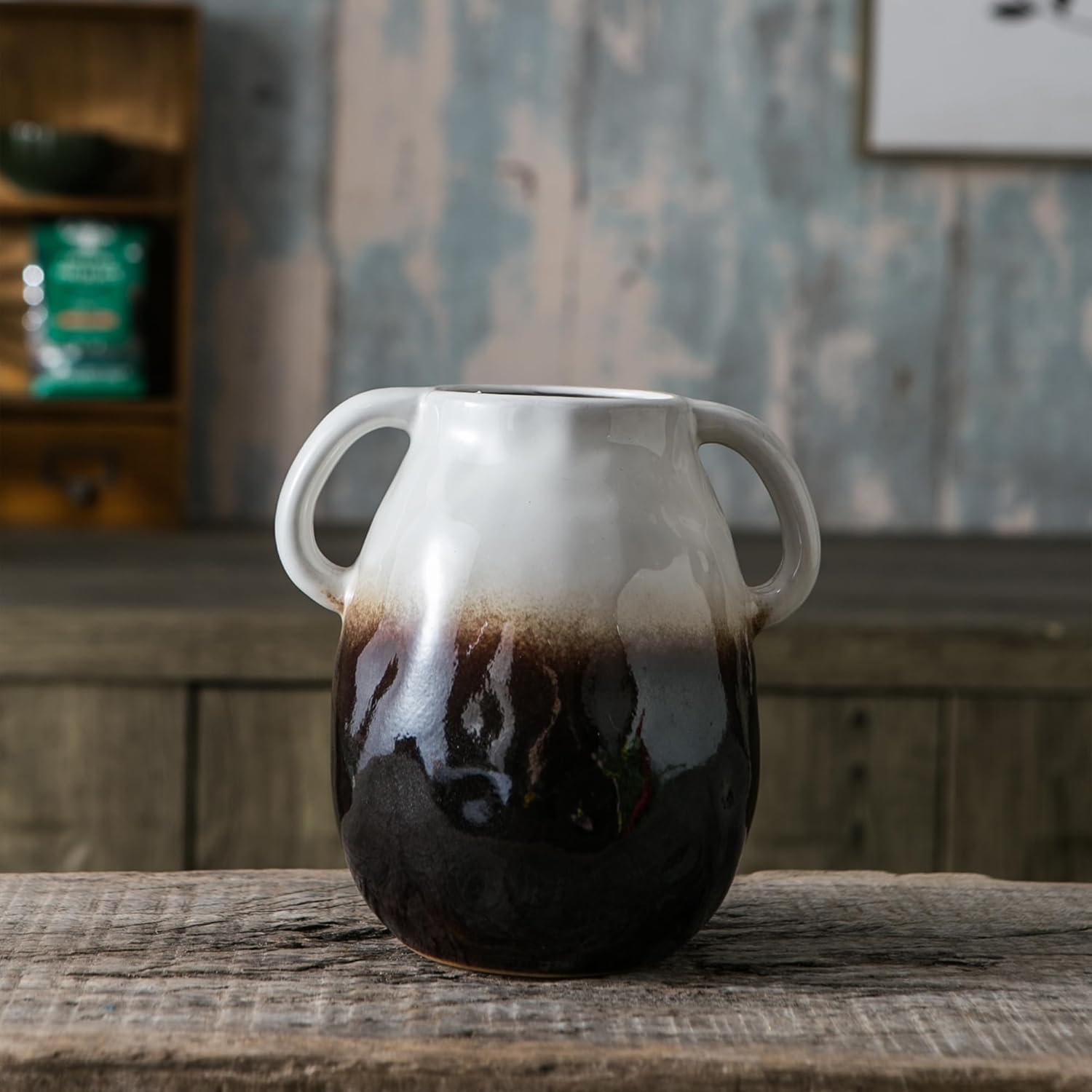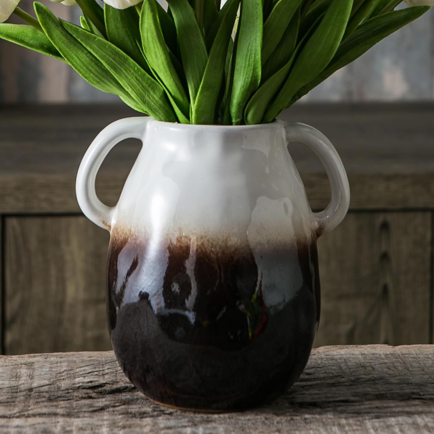 White Gradient Ceramic Vase with 2 Handles, Modern Farmhouse Decor, Rustic Terracotta Pottery, Decorative Flower Vases, Clay Small Vase, Centerpiece for Dining Table - 7 Inch Tall