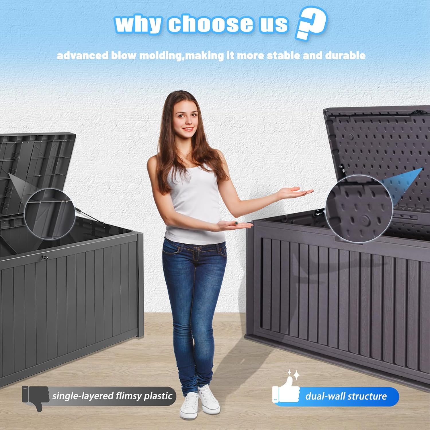 - Dual-Wall Design for All-Weather Use: The 100-gallon outdoor storage container is built with a dual-wall resin structure, offering superior durability and weather resistance. It maintains its appearance in any condition, making it an ideal outside storage box waterproof for gardens, backyards, and patios