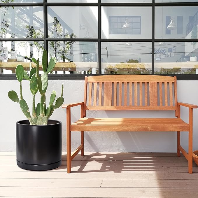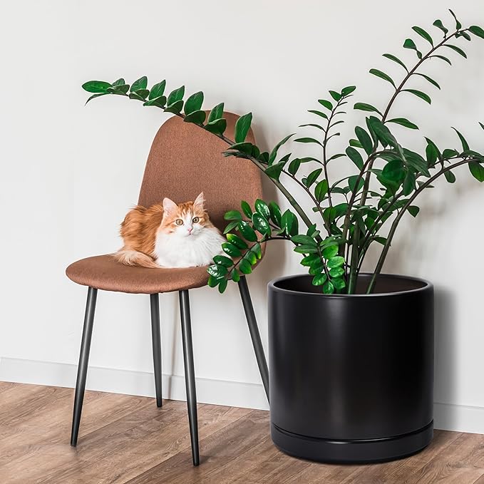 D'vine Dev 14 Inch Ceramic Planter Pot with Drainage Hole and Saucer, Indoor Cylinder Round Planter Pot, Black, 94-O-G-2