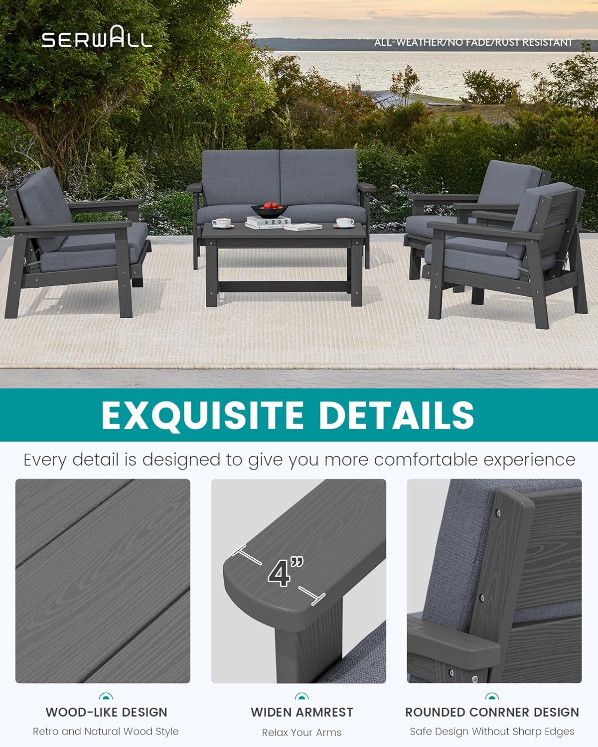 SERWALL HDPE Patio Furniture Set, 5 Piece All Weather Wood-Like Sectional Outdoor Furniture Set, Grey Patio Sofa Couch with Grey Cushions for Deck, Lawn
