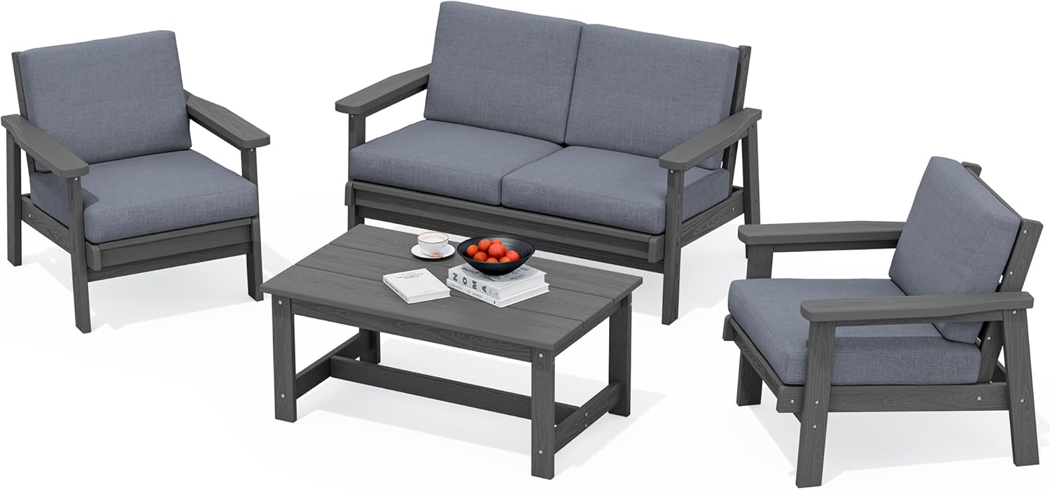 SERWALL 4 Piece HDPE Outdoor Furniture Set, All Weather Wood-Like Outdoor Sofa Sectional Couch, Grey Patio Furniture Set with Grey Cushions