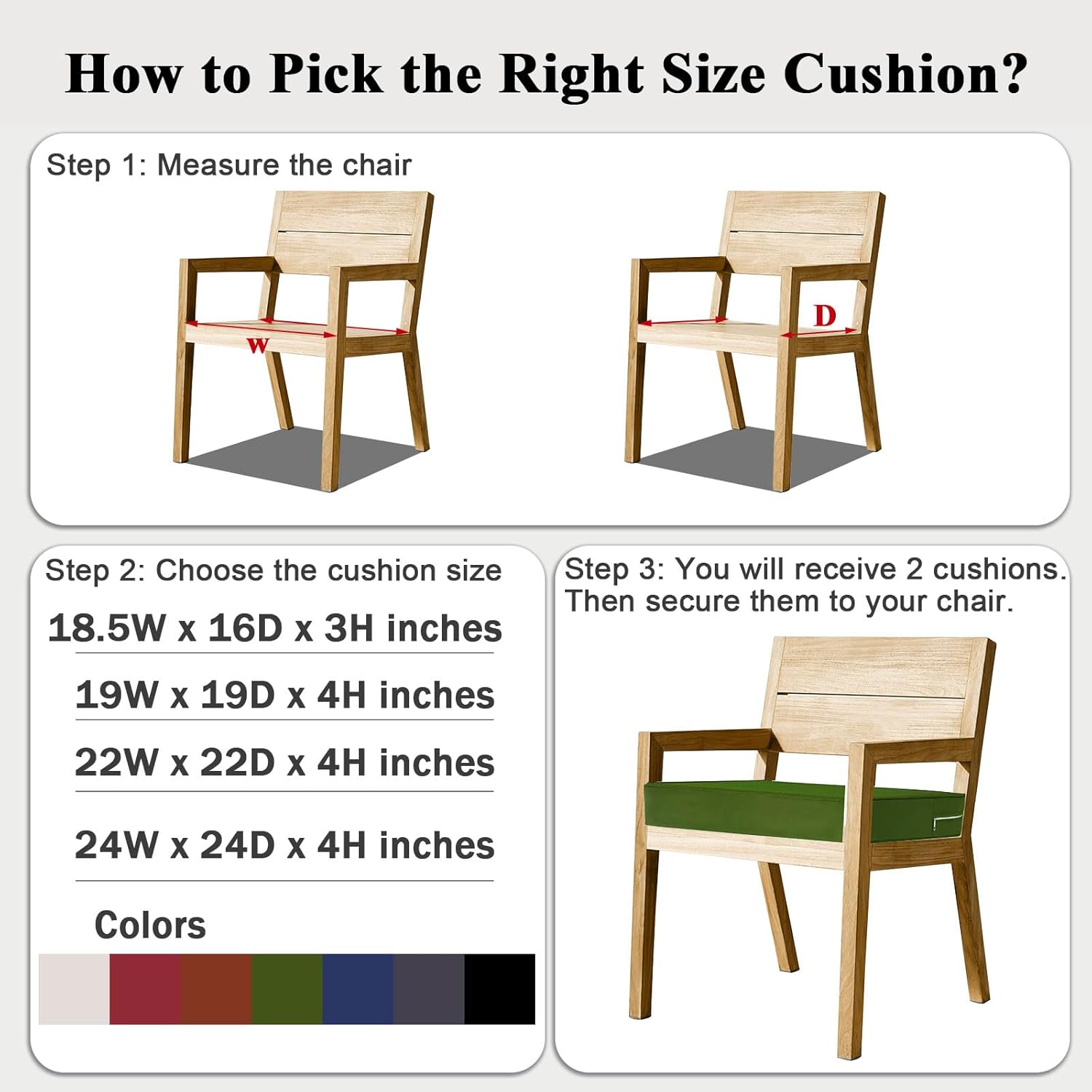 - PERFECT SIZE: Outdoor chair cushion set includes 2 cushions. Cushions measure: 18.5 inch (W) 16 inch (D) 3 inch (H). Fits most standard size outdoor chairs. Since the outdoor cushions are vacuum-packed, it may take 24-50 hours for the cushion foam to fluff back up after opening the vacuum bag