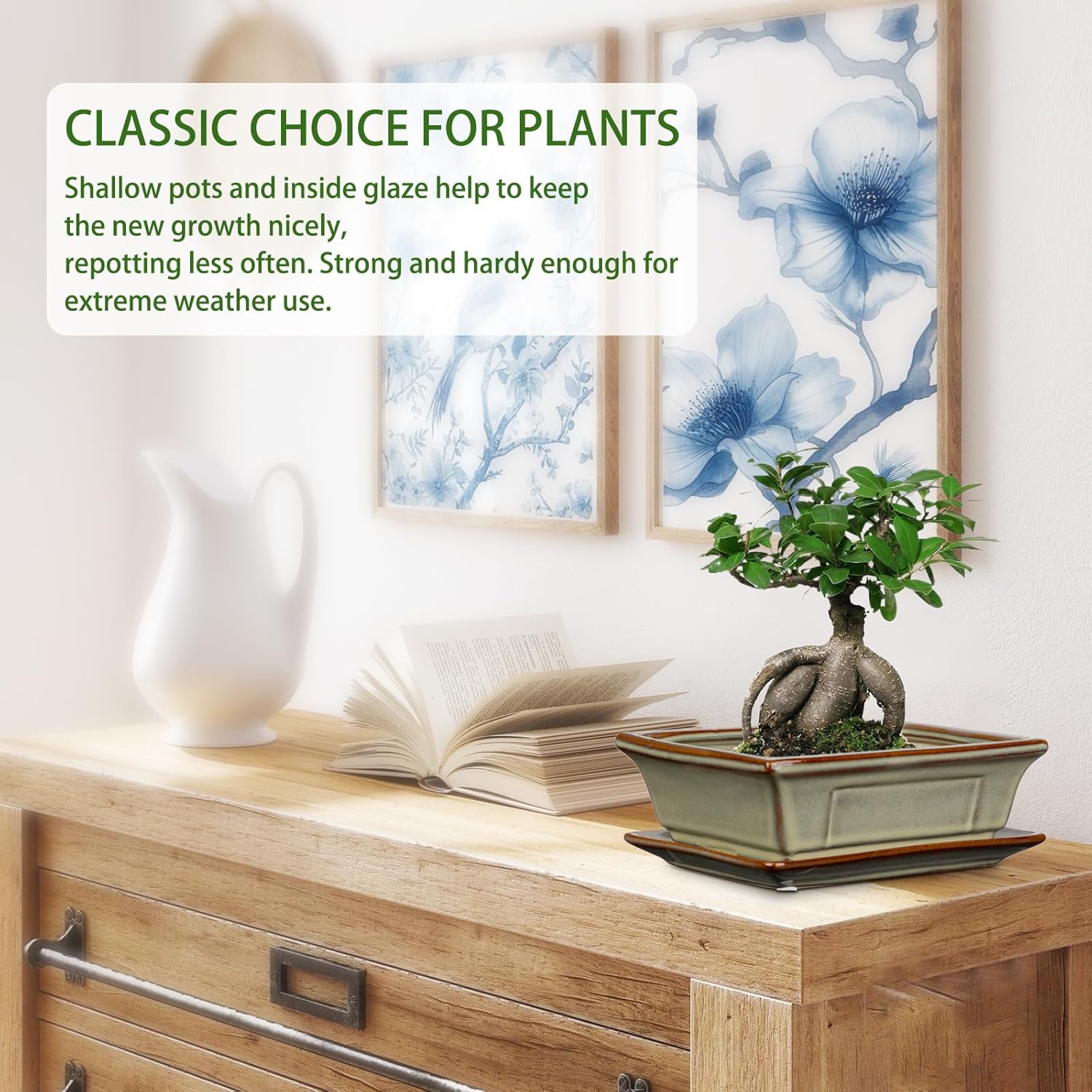 - Practical Set of 2 Compact Bonsai Pots Planters. The 7.5"Lx5.5"Wx2.4"H dimensions are perfectly sized for small spaces. Display the small bonsai pots in corners, on shelves, or as a paired centerpiece to add life to your decor. Two ceramic bonsai pots with drainage tray, endless possibilities—mix and match to create a mini indoor garden that sparks joy every time you walk by.
