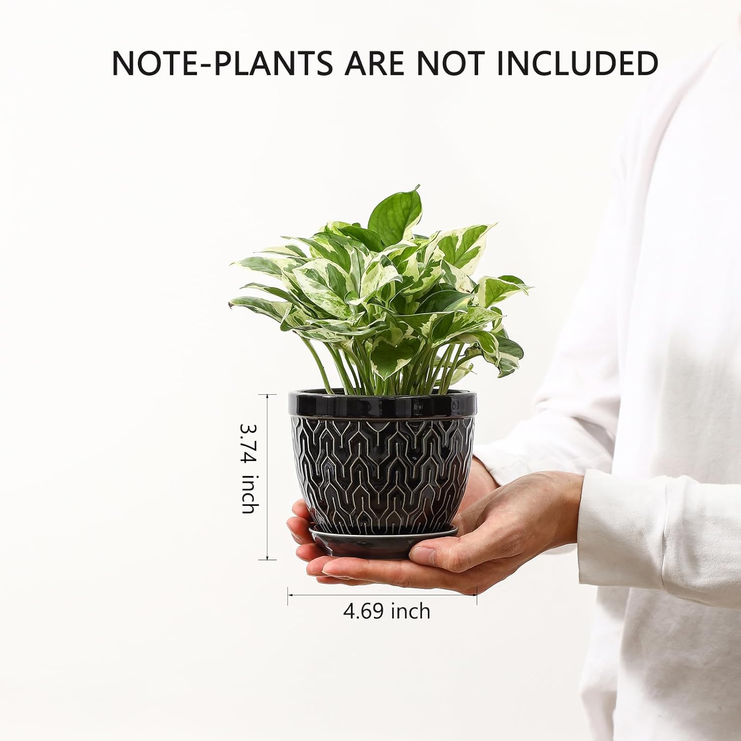 Sureasy Ceramic Plant Pots, 4.7 Inch Flower Pots for Indoor Plants, Succulent Pots with Saucer and Drainage Hole, Decorative Planter for Succulent, Cactus, Set of 4, Black