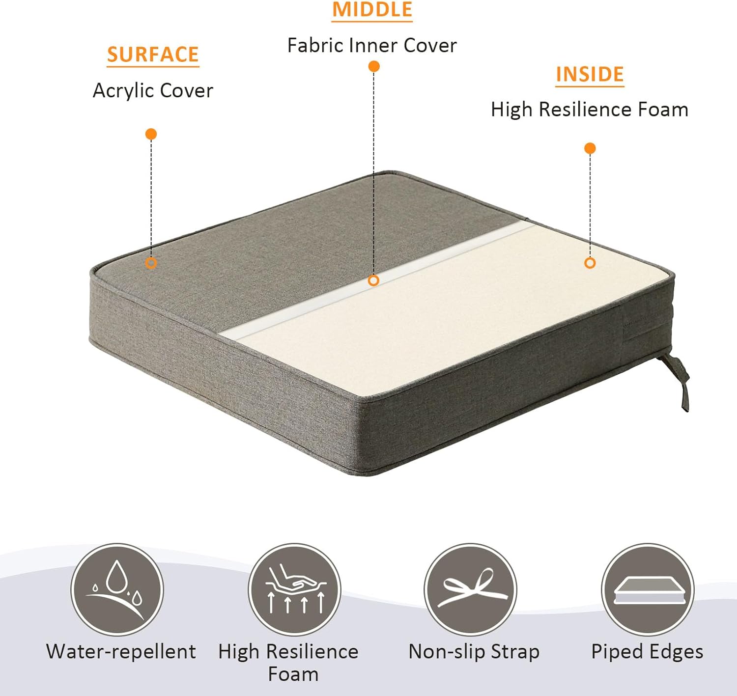 Sunbrella Square Corner Seat Cushions, 19" x 19" x 3", Set of 4, Indoor Outdoor Water Repellent Universal Chair Pads with Ties for Patio Furniture, Garden Dining Chairs, Cast Shale