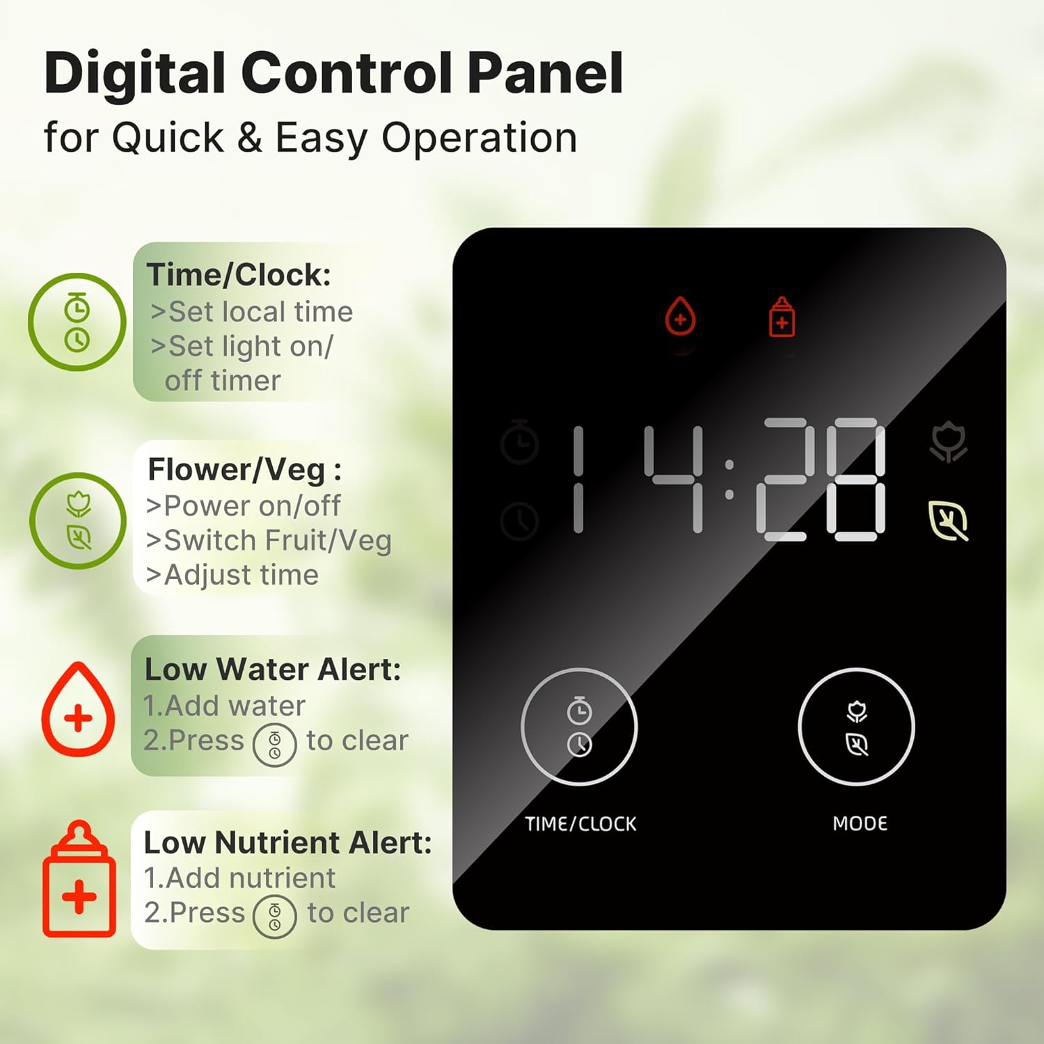 - 【Light Timer & Water Indicator】 This hydroponics growing system kit allows you to set the light start time to suit your unique growing needs. It also features water level indicators to ensure your plants stay healthy and thriving.
