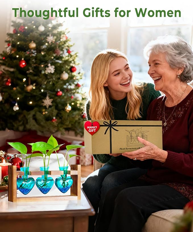Nacome Plant Terrarium Propagation Stations: Birthday Gifts for Plant Lovers Women Mom Wife - Wooden Stand Tabletop Planter 3 Bulb Glass Vase Heart Shaped for Hydroponics Indoor Home