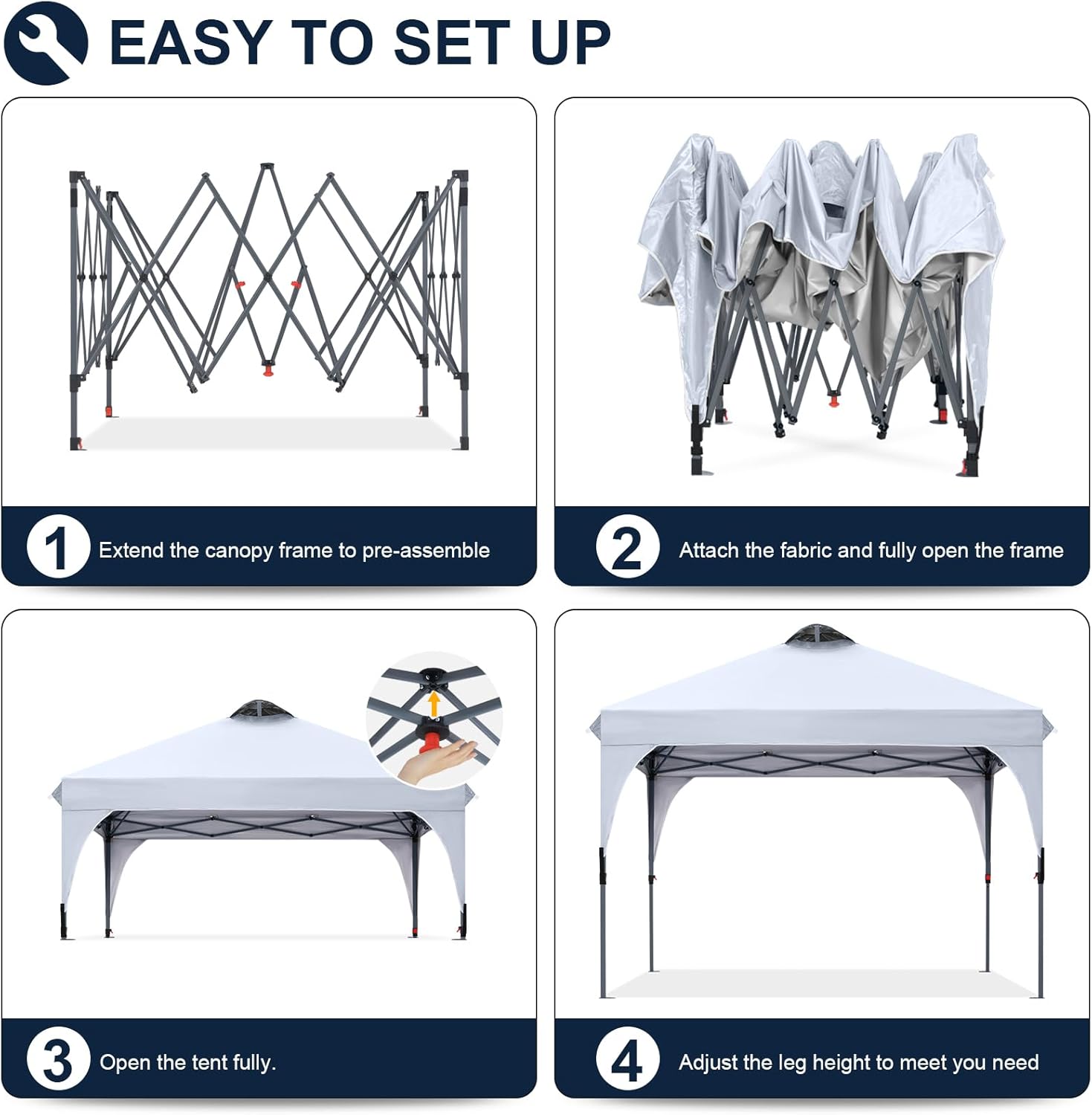 - 【Easy Setup on Seconds】This canopy tent enables 1 person set-up in 1 minute, which uses fully assembled One-Piece frame, no tools needed. Just open the frame, attach the fabric and adjust the legs height. Enjoy the shade quickly and easily under the sun.