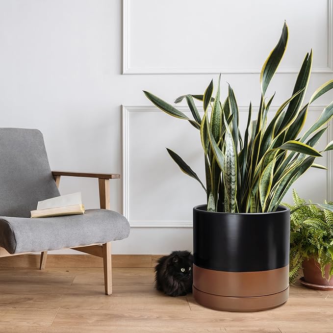 D'vine Dev 14 Inch Ceramic Planter Pot with Drainage Hole and Saucer, Indoor Cylinder Round Planter Pot, Black/Speckled Tan, 94-O-G-7