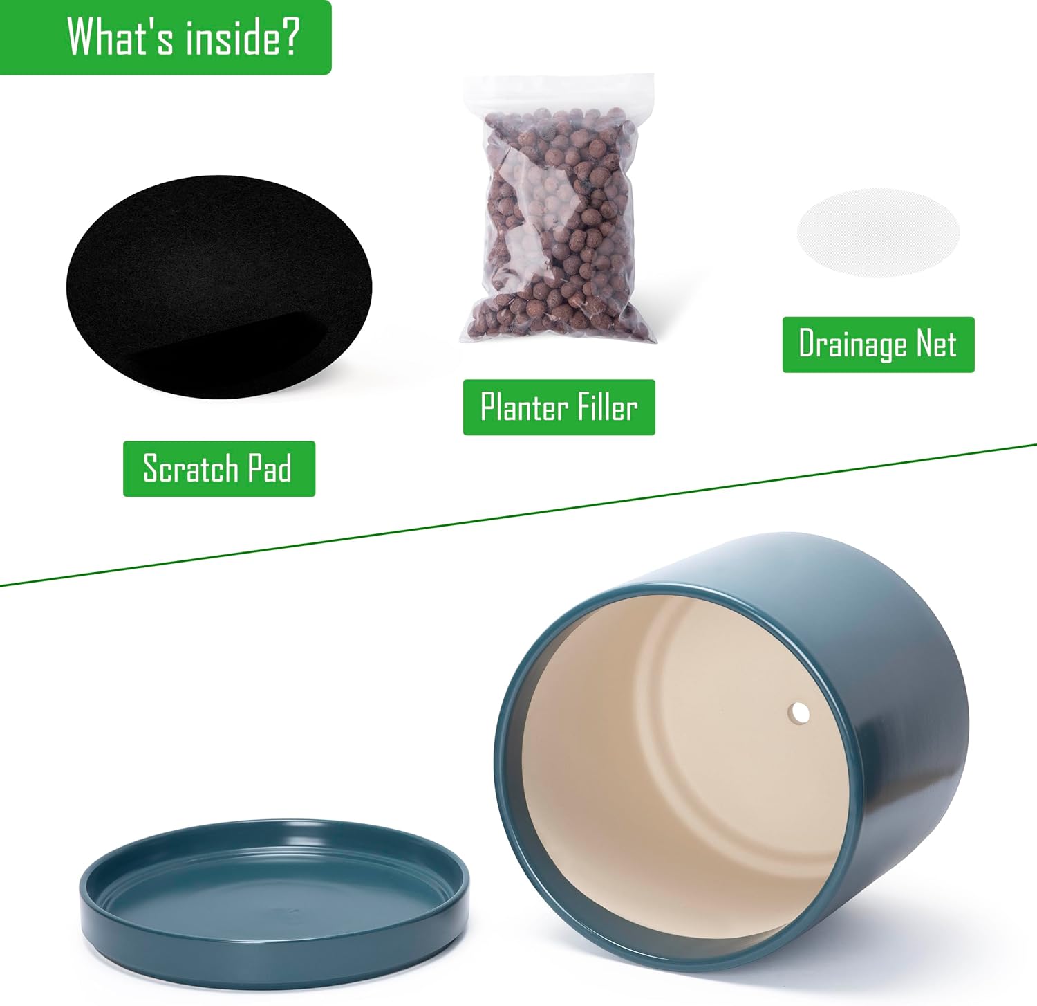 - Planter pot with drainage hole, mesh drainage net and protective scratch pad included.