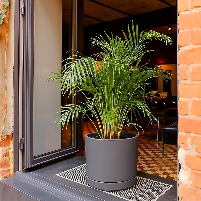 D'vine Dev 14 Inch Ceramic Planter Pot with Drainage Hole and Saucer, Indoor Cylinder Round Planter Pot, Speckled Grey, 94-O-G-3