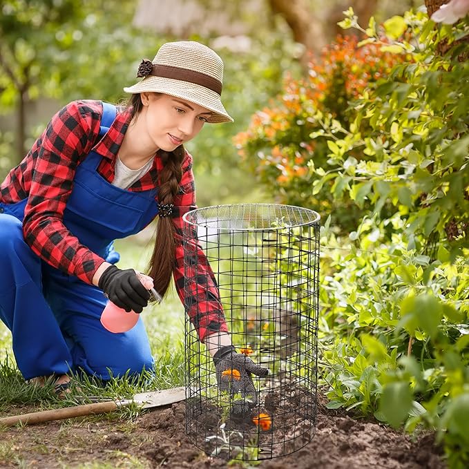 - Easy To Assemble:You don't need extra tools, just enclose 3 pieces of metal mesh and secure them together with nylon hand straps. Then place the assembled wire plant cage around the plants, add a lid and you're done. Secure them in the soil with U-shaped ground plugs to make sure they are secure enough.