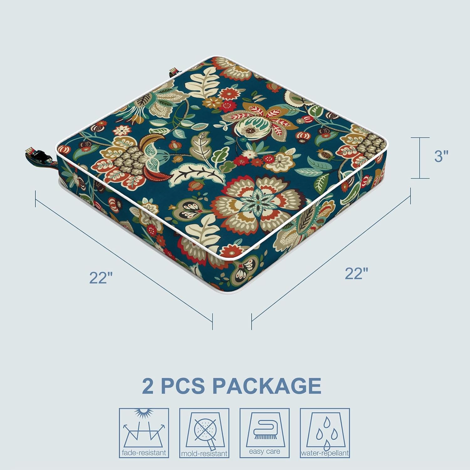 - PACKAGING: Includes 2-Pack outdoor chair cushions 22" x 22" x 3", perfect for patio chairs, garden sofas and more. Due to the vacuum compressed status, please allow 48 hours to restore thickness after opening the package