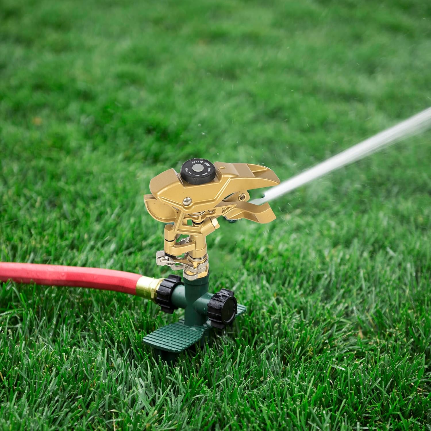 - Adjustable Design: The garden sprinkler features a 0-360 degree adjustable spray pattern. You can customize the spray distance and angle using the adjustment settings on the sprinkler head to meet your specific needs. The black component on the top can adjust the spray distance
