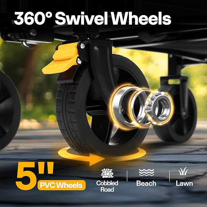 - 360° SWIVEL WHEEL: This collapsible wagon is equipped with four 5-inch PVC all-terrain wheels designed to handle hard sand, grass, and uneven surfaces; The rear wheels include brakes for added stability when parked on slopes; Perfect for gardening tasks like hauling various flowers, fertilizers, and gardening supplies with ease