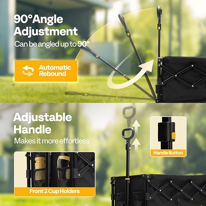 - FLEXIBLE HANDLE: The adjustable handle can be angled up to 90° in both upward and downward directions; With its extended adjustable handle, the wagon can be easily maneuvered even when carrying heavy loads, ensuring a smooth and effortless pulling experience