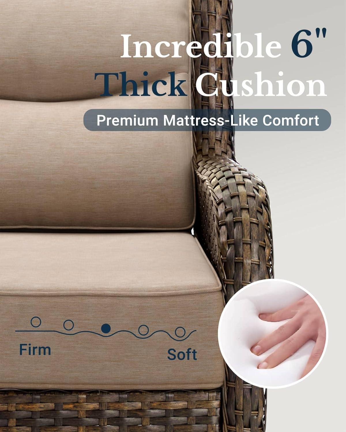 - 6-Inch Thick Seat Cushions: Each cushion on our patio swivel chair and sofa features 6-inch thick, 28D high-density foam—delivering up to 40% more depth, 30% better bounce-back, and 2x the durability compared to the standard 4-inch cushions found in most outdoor sets. Sit back, relax, and feel the lasting difference