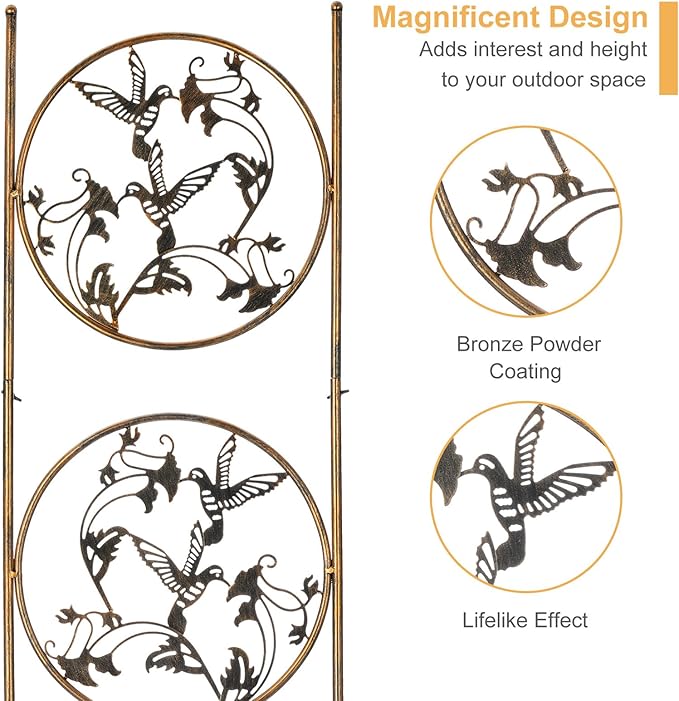 - Garden Decor: This pair trellis features 6 lifelike hummingbirds perch on the cattails with bronze powder coating, and it comes with ornate leaf curling design which encourages your climbing vines and flowers to flourish. Hummingbird wings are finished with a lifelike effect
