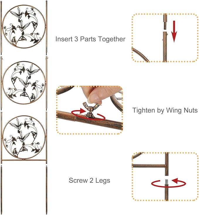 - Easy to Assemble: This pair of trellis is handcrafted and constructed of sturdy, it made from iron under a thick finish of bronze powder-coat. Easy installation is required, just insert 3 parts together, tighten by wing nuts and screw 2 legs on to stake into the ground or pots