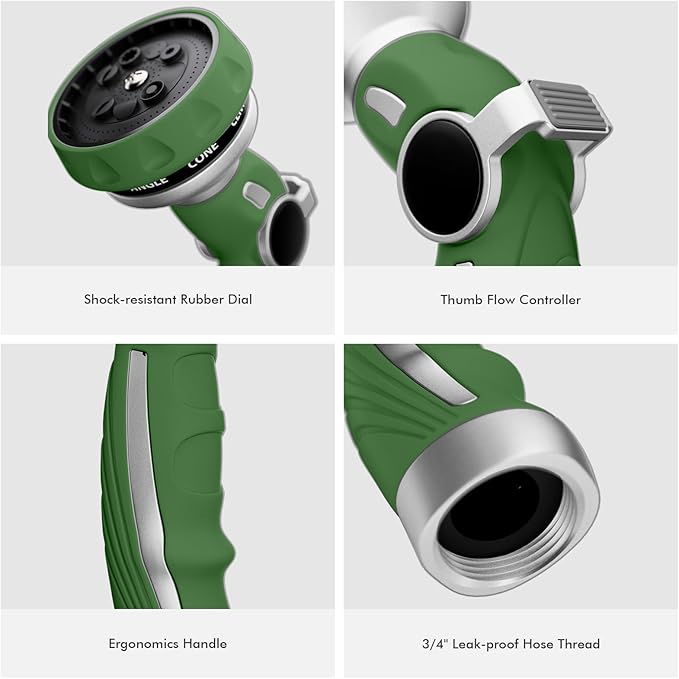 - 【Heavy Duty Metal Hose Nozzle】Constructed with premium zinc-alloy material, this hose nozzle sprayer is solid & strong to resist daily drops and shocks. The bronze powder painting, TPU coating and rubberized bezel dial can enhance durability & flexibility and withstand hard impacts & heavy force. A long-lasting garden hose nozzle you can count on many years.