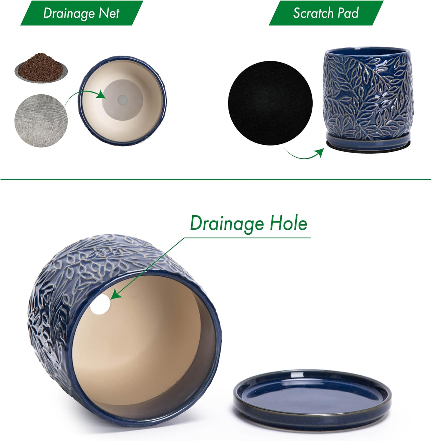 - Drainage Hole and Saucer: Each pot comes with pre-drilled drainage hole and matching ceramic tray to drain excess water.