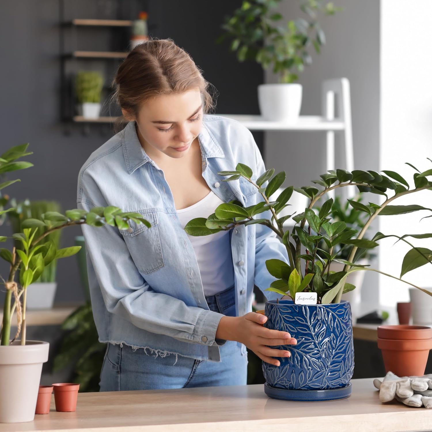 D'vine Dev 6 Inch Embossed Leaves Stoneware Planter Pot with Drainage Hole and Saucer, Midnight Blue, 27-A-X-3