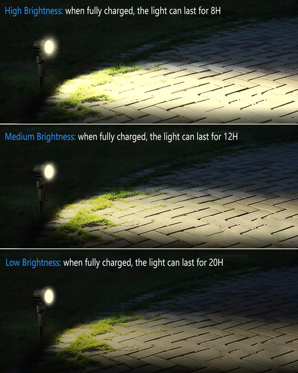 - Control Box & Large Capacity Battery: Solar Landscape Spotlights use a waterproof control box. The indicator lights can display different power levels, which is good for monitor battery power at any time. The charging indicator of the new solar panel will light up when charging, which is convenient to check the working status of solar panels. 6V/6W solar panel, the battery capacity is 6000mAh, and the light can work for 20H after full charging (8H under highlight)