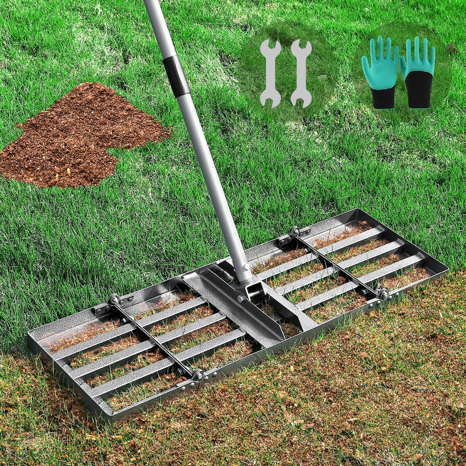 - MULTIFUNCTIONAL LAWN TOOL: Compared to traditional landscape rakes, REAPALOT lawn leveling rake can spread topsoil, fertilizer or sand on the lawn more quickly and effectively, creating new and absolutely level lawns, leveling out unevenness and remove larger debris in your lawn. Suitable for yard, garden, farm, golf courses and so on.