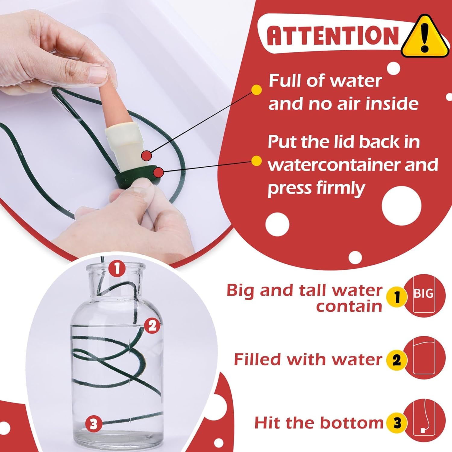 - š³SELF WATERING PLANTERS INSERT: Save your time and your plants.Soak the clay cone at least 15mins,put the lid back in water container and press firmly. Create a vacuum environment by ensuring the green pipe is full of water and no air inside,put the hose into the container and insert this stake into the soil,itās started to work for your plants. Set up easily.