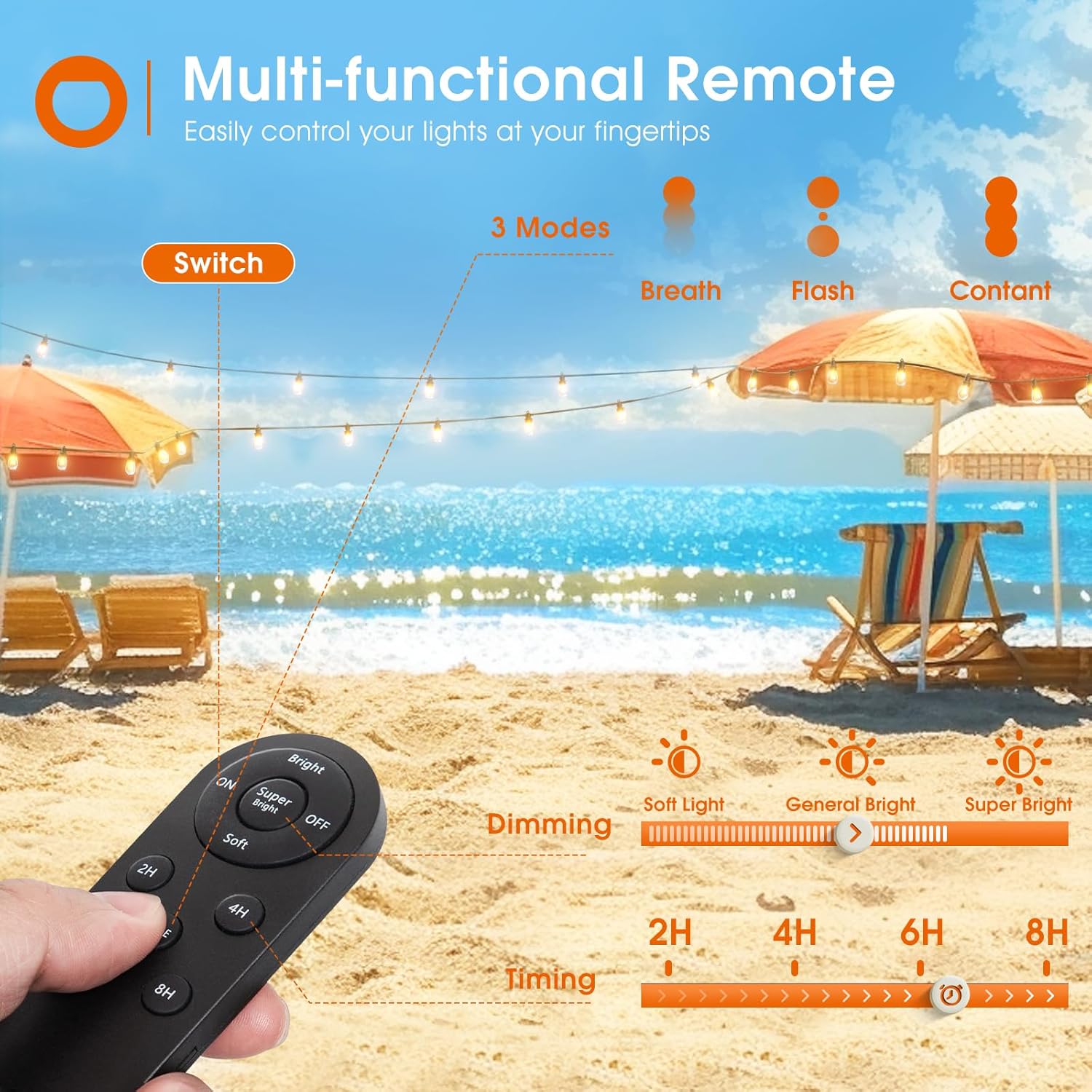 - UPGRADED! Remote Control: Intelligent remote control well integrates convenience and humanization, defining a new generation solar string lights. 3 Brightness Mode: Soft/Bright/Super bright. 3 Light Mode: Breathing/Flashing/Constant. 4 Timing Control: 2/4/6/8 Hrs. There is no need to buy an additional timer, making saving energy and saving power so simple and easy
