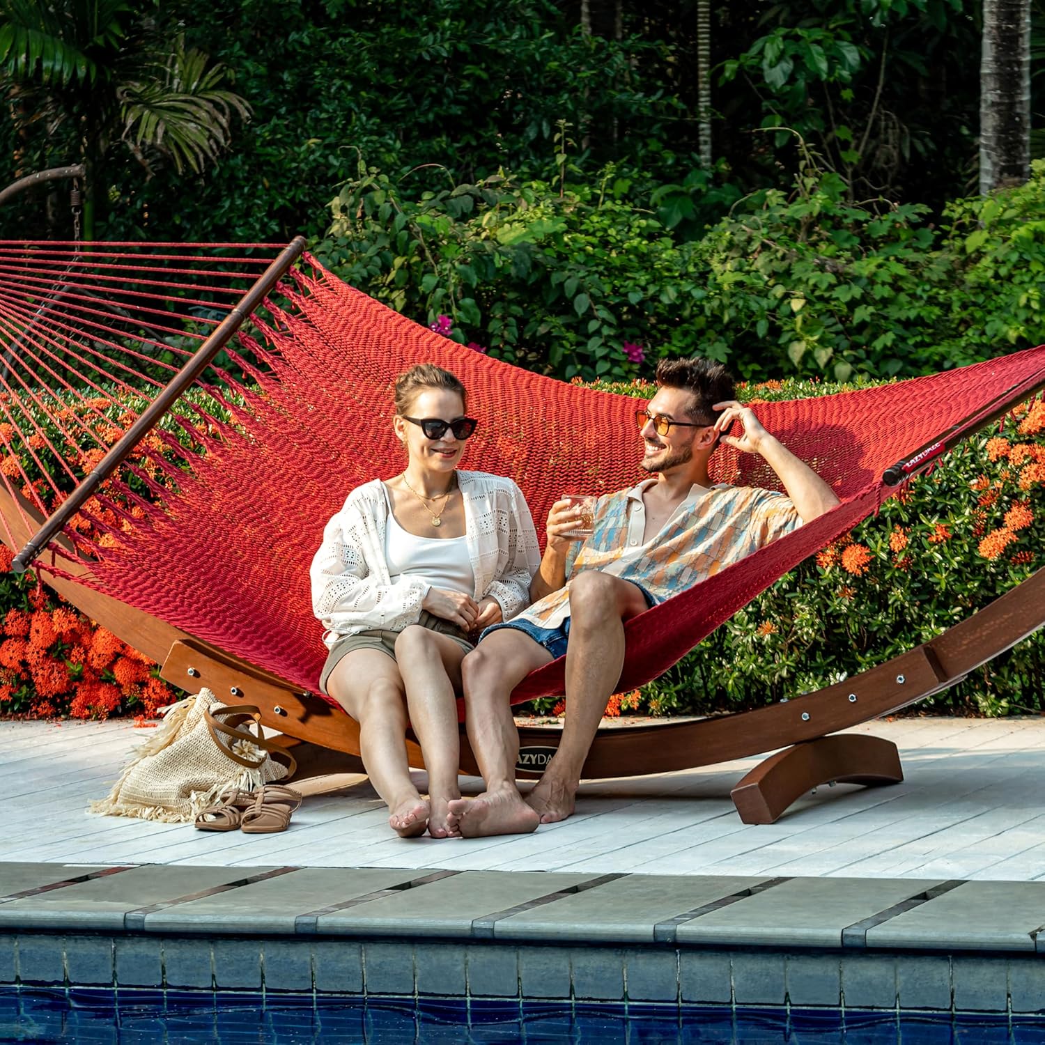 Lazy Daze Hammocks 10.5 FT Double 2 Person Caribbean Rope Hammock, Hand Woven Polyester Hammock with Spreader Bars, for Outside Outdoor Backyard Patio Poolside,450 LBS Capacity,Red