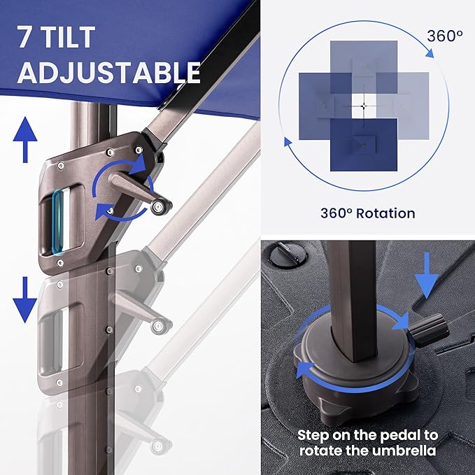 - 360° Rotation and 7 Tilt Adjustable: By stepping on the foot pedal, the outdoor umbrella can be rotated 360° horizontally; The integrated crank system makes the patio umbrella easy to open and close, 7 tilt adjustment can provide multi-angle shading needs