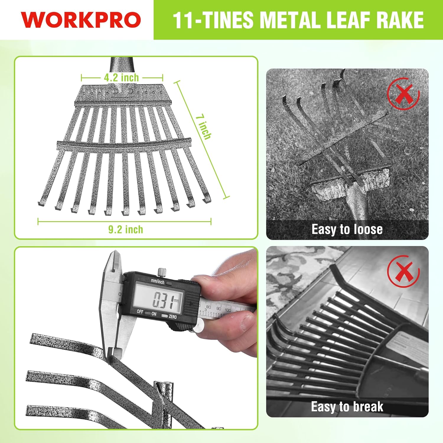 - Compact Narrow Rake Head: The 9-1/5 inch wide rake head with 11 close-spaced steel tines is perfect for getting into hard-to-reach areas like flower beds, under bushes, and tight corners. It collects leaves effectively without clogging between tines