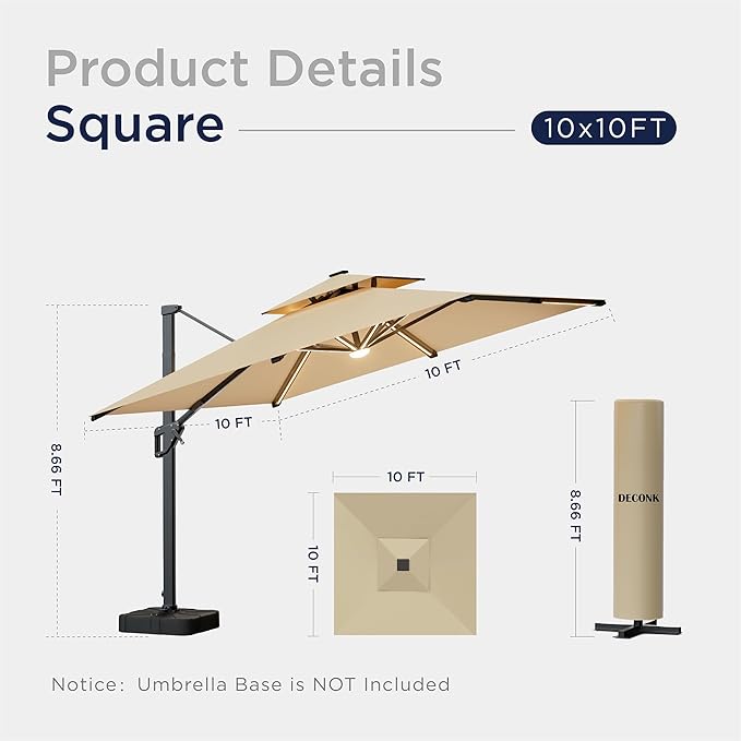 - 10 FT Cantilever Patio Umbrella with Lights: Fillable umbrella base is not included; The cantilever umbrella with 8 heavy-duty led ribs, 4-hour runtime (solar rechargeable), and 3 adjustable brightness modes; Ideal for outdoor comfort