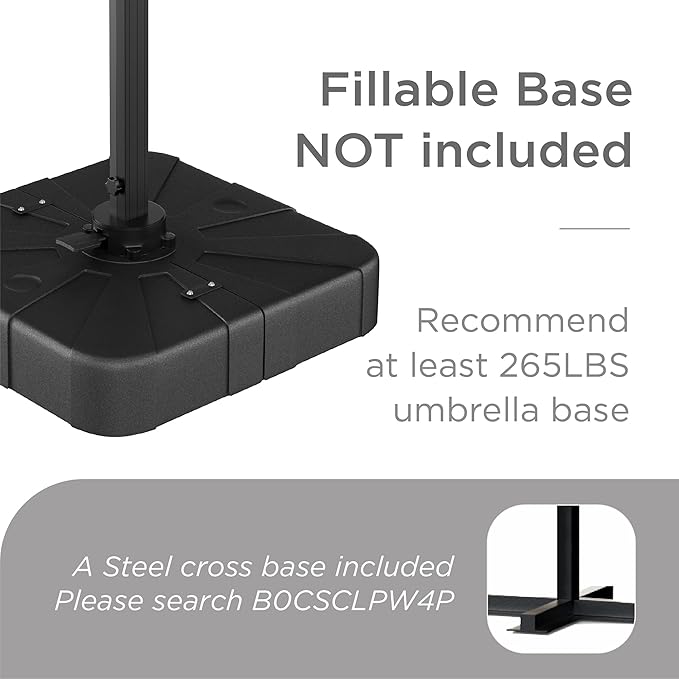 - Installation Guide: Large patio umbrella come with a steel cross base and umbrella cover; Please make sure the cantilever umbrella is secured with a 220 lbs fillable umbrella base or use another method to secure it to the deck or ground