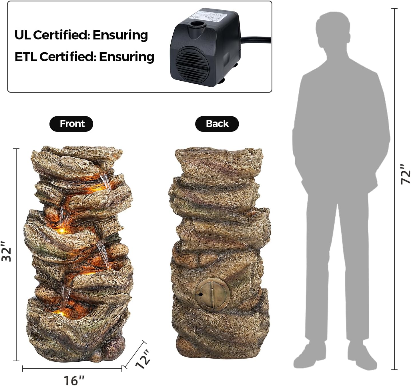 - Weather-Resistant Design: Constructed from resin with a authentic wooden appearance, this outdoor garden fountain is waterproof, rust-resistant, and built to last, adding an artistic flair to your outdoor environment.